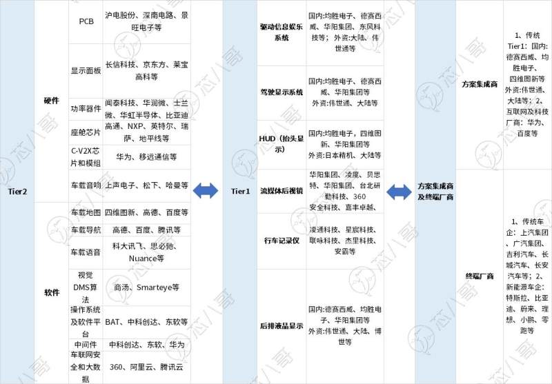 Tier1方面,主要为车载信息娱乐系统、驾驶信息显示系统、HUD、流媒体后视镜、行车记录仪、后排液晶显示等细分部件生产商。近年来,Tier1厂商为了增加产品的整体价值,在集成仪表中控、后座娱乐、HUD、语音等基本功能的基础上,还进一步集成了环视、DMS以及部分ADAS等功能,最终以智能座舱域控制器的形式进行配套销售。