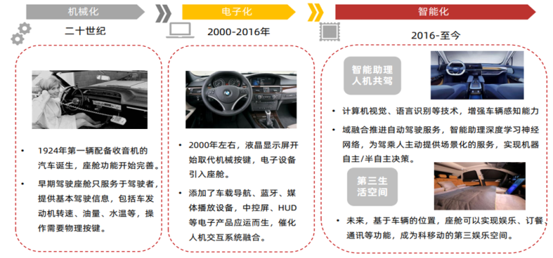 从汽车座舱的发展路径来看,技术进步推动智能座舱沿着机械化-电子化-智能化-高级智能化的方向不断升级与迭代。