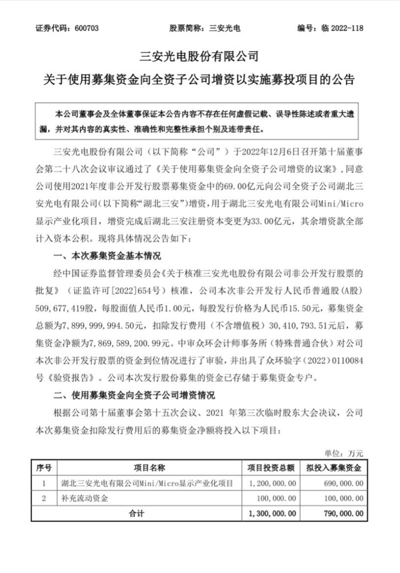 IT之家 12 月 7 日消息,三安光电发布公告称,公司于第十届董会第二十八次会议审议通过了《关于使用募集资金向全资子公司增资的议案》,同意公司使用 2021 年度非公开发行股票募集资金中的 69.00 亿元向公司全资子公司湖北三安光电有限公司(以下简称“湖北三安”)增资,用于湖北三安光电有限公司 Mini / Micro 显示产业化项目。