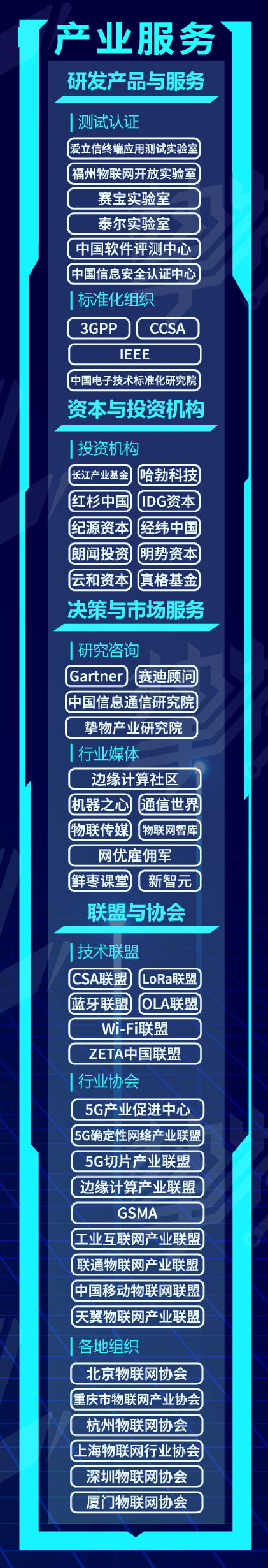 “产业服务”板块主要包括AIoT产业相关的各类联盟、协会、机构、媒体、投资基金等,这些组织为产业提供包括检测、标准制定、媒体、咨询、投融资等服务,是推动产业发展的重要力量。