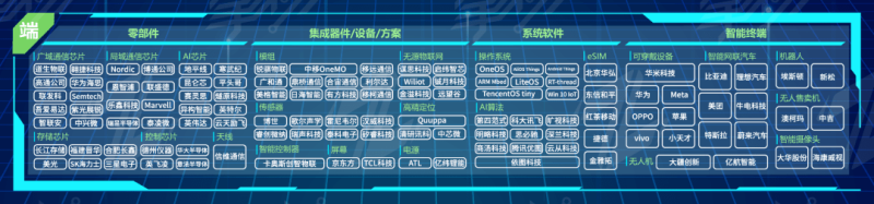 “端”指的是物联网终端,主要包括底层的芯片、模组、感知设备、AI底层算法、操作系统等。
