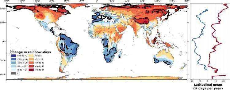 如今,每年地球陆地上出现彩虹的平均天数是117±71天,根据模型的预测,到了2100年,全球平均彩虹天数还会在此基础上增加4~5天。