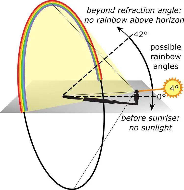 最后,还必须在雨后有阳光直射大气层,并与观看者的眼睛成42°的角度——这是世界上大多数地区的清晨或午后。