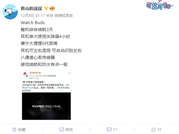 由于加入了无线耳机,因此有不少网友担心手表整体续航能力,据经销商“看山的叔叔”透露,华为Watch Buds整机综合续航为3天,耳机在关闭降噪后单次可使用4个小时。