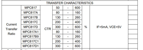 CTR这个参数指的是输出电流和输入电流之间的比值的百分比就叫做电流输出比,CTR值越大,表明光耦越省电,相对的也更容易受到干扰。反之亦然,CTR值越小,光耦的输入端就需要更大的电流,即越耗电越稳定。通过下图规格书可以知道CTR详细数值。