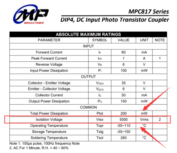 这个参数在选型时非常重要,因为光耦是起隔离作用的元器件,那么输入和输出之间能隔离多少的电压?这就需要通过隔离电压这个参数来体现,隔离电压的意思是光耦的输入和输出之间短时间所能承受不被击穿电压的最大值。