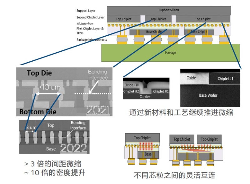 与IEDM 2021上公布的成果相比,英特尔在IEDM 2022上展示的最新混合键合研究将功率密度和性能又提升了10倍,并且还通过混合键合技术将互连间距继续微缩到3微米,实现了与单片式系统级芯片(system-on-chip)连接相似的互连密度和带宽。