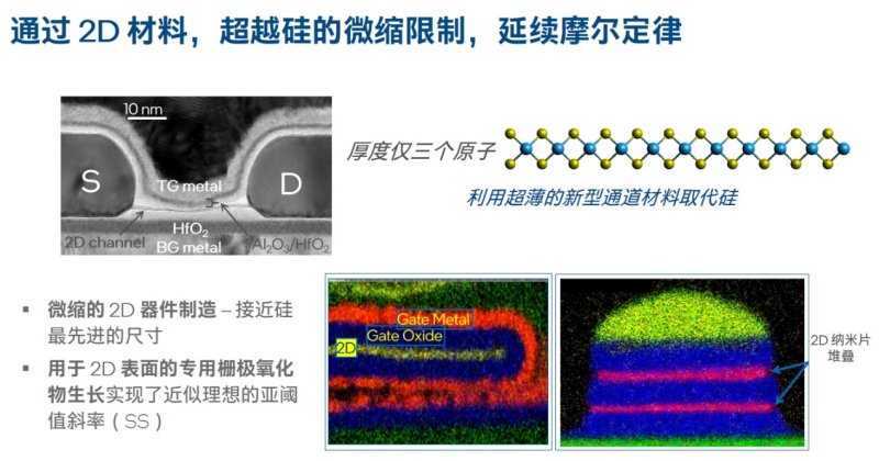 按照宋继强博士的说法,随着GAA晶体管架构源极和漏极之间的间距进一步缩小,会产生比较明显的短沟道效应,既容易产生漏电,又不容易控制电流的通断,传统的硅材料作为主要的通道材料此时遭遇了明显的瓶颈。而如果换成过渡金属硫化物,由于它本身是一种厚度仅为三个原子的二维材料,轻薄且导电性强,非常适合作为源极-漏极的通道材料。