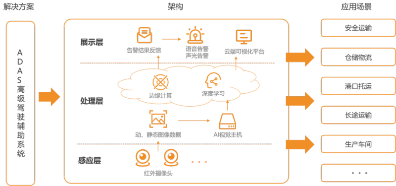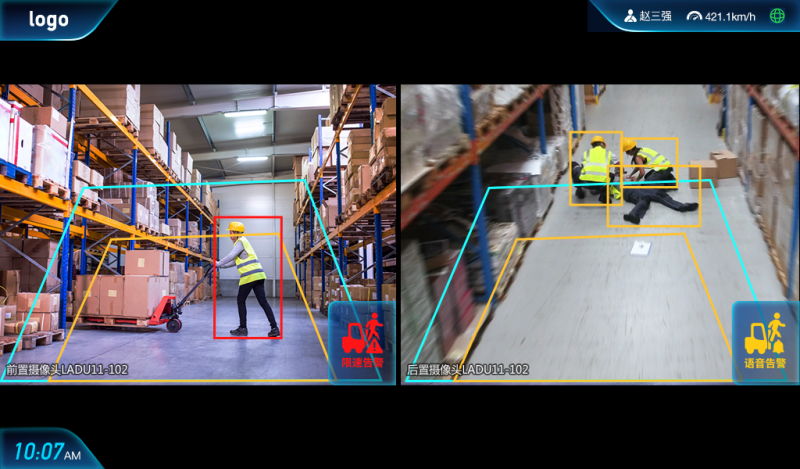 ADAS叉车防撞系统,采用基于国产AI芯片的嵌入式智能终端,通过部署在车辆不同位置的多路摄像头,对叉车周围的人、物等进行实时检测、识别、跟踪并对其进行位置探测,在预测潜在发生危险情况时进行声光电告警并输出信号,对车辆进行控速,可有效防止车辆碰撞等事故发生,保障车辆运行安全。