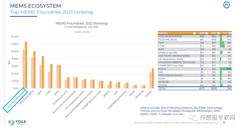赛微电子是当前全球MEMS芯片代工第一企业,其MEMS芯片代工份额主要来自于旗下全资子公司,位于瑞典的Silex Microsystems AB。Silex 2021年MEMS代工销售额为1.26亿美元,同比增长20%。(相关信息可参看:最新全球MEMS晶圆厂排名:中国蝉联榜首,台积电取代索尼,博世增长超100%!)