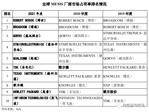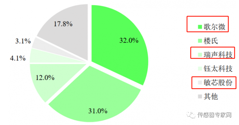 除歌尔微外,中国MEMS厂商在声学传感器领域表现不俗,瑞声科技、敏芯股份等均位列声学MEMS传感器全球市场份额TOP 4之内,是中国传感器产业为数不多的亮点。