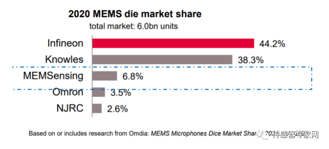 据知名咨询机构Omdia《MEMS Microphones Dice Market Shares 2021》报告显示,敏芯股份(MEMSensing)在2020年全球声学MEMS芯片出货量中,占比6.8%,排名全球第三,是国内出货量最大的声学MEMS芯片企业。
