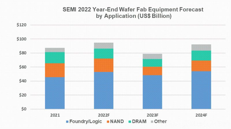 包括晶圆加工、晶圆厂设施和掩模/掩模版设备在内的晶圆厂设备领域预计将在2022年增长8.3%,达到948亿美元的新行业纪录,随后将在2023年收缩16.8%至788亿美元,2024年反弹17.2%至924亿美元。