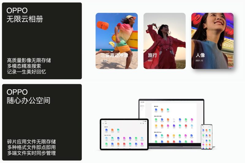 OPPO无限云相册:OPPO将全面升级存储空间、提升多模态搜索能力与主动推荐服务。即便是5000万像素的照片与4K超清视频也可安心存储,拥有更精准的搜索与更精彩的回忆相册生成体验。