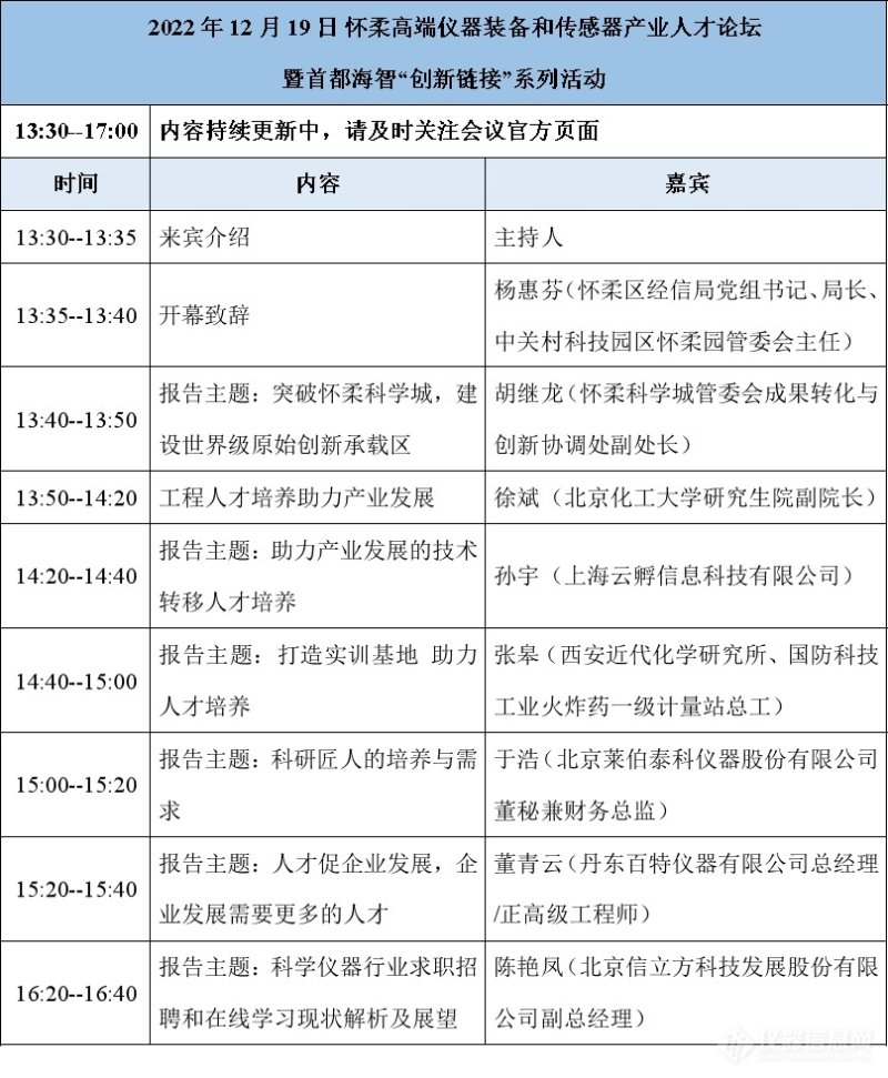 为加快实施人才强区战略,广泛链接高端仪器装备和传感器产业高级专业技术人才和管理人才,以人才为引领推动怀柔区高端仪器装备和传感器产业发展,更好地促进区域经济高质量发展,北京怀柔仪器和传感器有限公司联合北京信立方科技发展股份有限公司(仪器信息网www.instrument.com.cn) 将于2022年12月19日下午通过仪器信息网3i讲堂平台线上举办“怀柔高端仪器装备和传感器产业人才论坛暨首都海智‘创新链接’系列活动”主题网络研讨会。