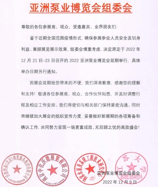 鉴于近期全国范围疫情形式,确保参展参会人员安全及切身利益、兼顾展览展示效果,组委会慎重考虑,决定原定于2022年12月21日-23日召开的2022亚洲泵业博览会延期举行,具体举办日期另行通知。