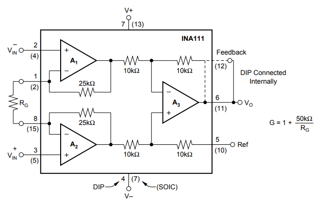 INA111 采用 8 引脚塑料 DIP 和 SOL-16 表面贴装封装,额定温度范围为 -40°C 至 +85°C。