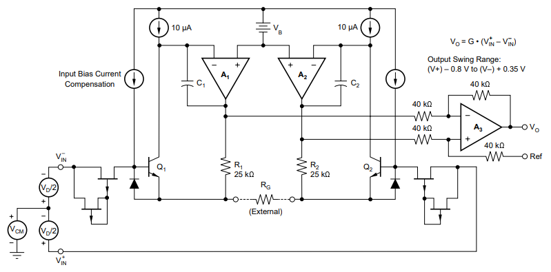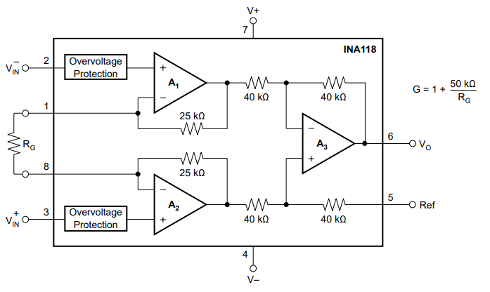单个外部电阻器可设置 1 至 10000 之间的任何增益。内部输入保护可承受高达 ±40 V 的电压而不会损坏。