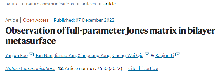 相关成果Observation of full-parameter Jones matrix in bilayer metasurface于近日发表在期刊《自然通讯(Nature Communications)》。