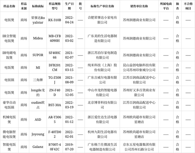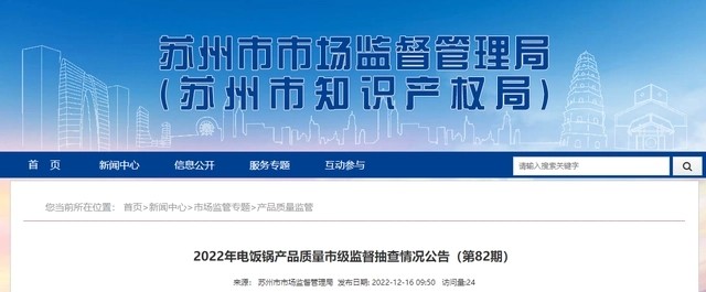 12月16日,江苏省苏州市市场监管局网站发布2022年电饭锅产品质量市级监督抽查情况(第82期)。本次电饭锅产品质量监督抽查共抽样10批次,其中企业抽样0批次,市场实体店购样10批次。经检验,合格10批次,合格率为100%。