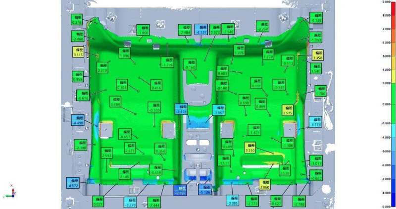 配合专业扫描软件,实时呈现直观的三维扫描结果。将扫描获取的数据与CAD模型对比,完成曲面分析检测,通过三维软件生成直观的色谱偏差图,精准定位问题区域,为后续产品二次开发提供数据指导,同时还可以为主机厂提供三维数字化的检测报告。