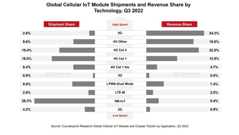 尽管物联网模块出货量增长放缓,但由于5G和4G Cat 4模块的组合较高,2022年第三季度的物联网模块收入同比增长12%。
