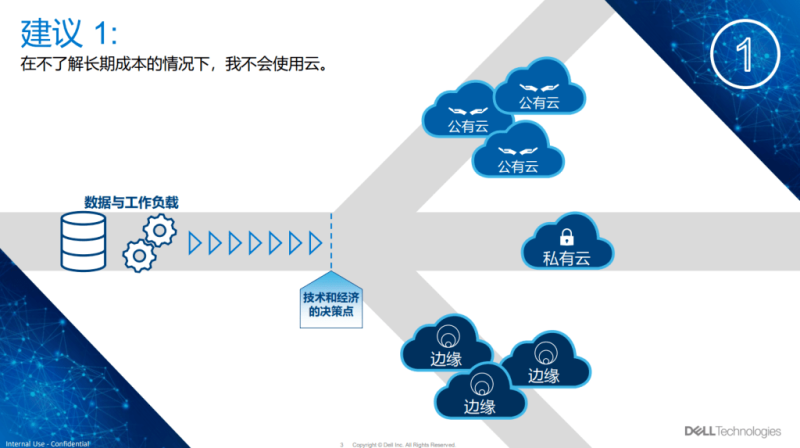 公有云成本是可变的,而企业的IT预算通常是固定的,为避免预算超支情况发生,John Roese建议企业在上云不仅要关注技术本身,更要充分考虑使用云环境的短期和长期成本。