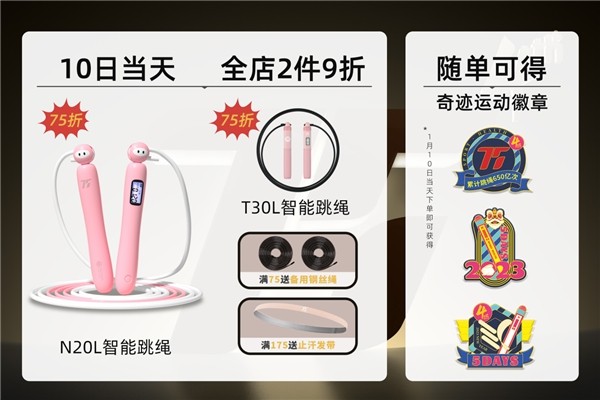 2023年1月10日,国内智能运动产品的领导品牌75派将满4周岁了!在这四年中,75派与众多运动爱好者一起创造了许多奇迹,也共同见证了彼此的成长与改变。4年间,75派与百万跳友在派健康上共同累计跳绳超过650亿下!为了感谢广大用户多年以来的一贯支持与认可,75派将在4周年品牌日来临之际,开启“奇迹之旅“系列活动,让75派的数字运动健康管理的理念和专业智能跳绳运动产品,一起触达更多热爱运动的人们,让更多人可以通过跳绳等运动不断遇见更好的自己,创造属于自己的奇迹。