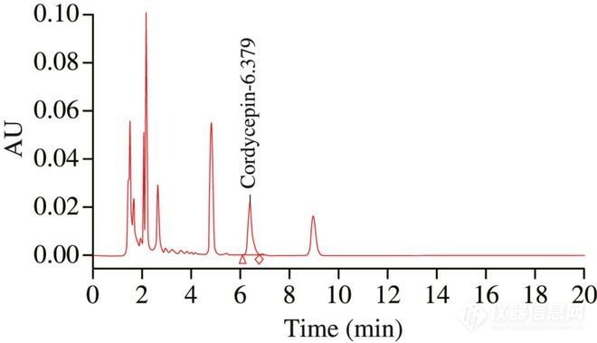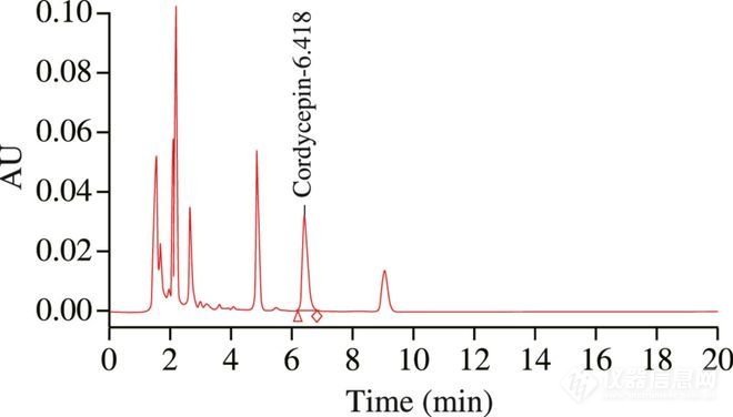 A:质量浓度为1 000 mg/L的虫草素标准溶液;B:经三氯甲烷提取法得到的蛹虫草1号样品