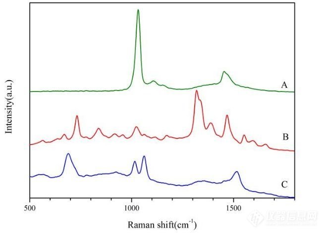 A:未添加拉曼基底;B:金纳米胶体;C:银纳米胶体