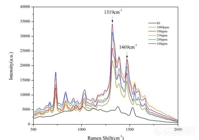 对质量浓度为100、200、250、500、1 000 mg/L的虫草素标准品待测液采用最佳方法进行检测得到的拉曼光谱图如图7所示,可以看到,不同浓度虫草素标准品均有较好的信号响应且峰形相似,(1 319 ± 3) cm-1、(1 469 ± 3) cm-1处有特征峰。