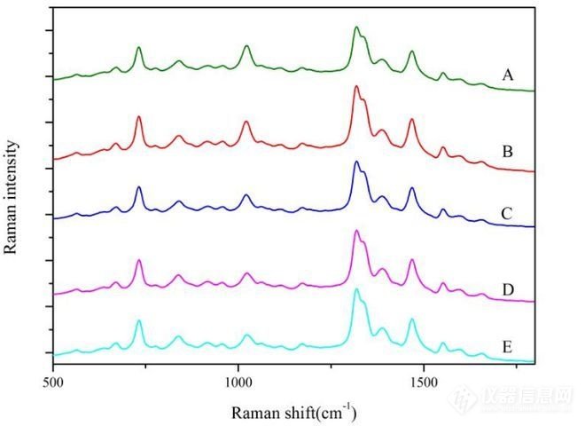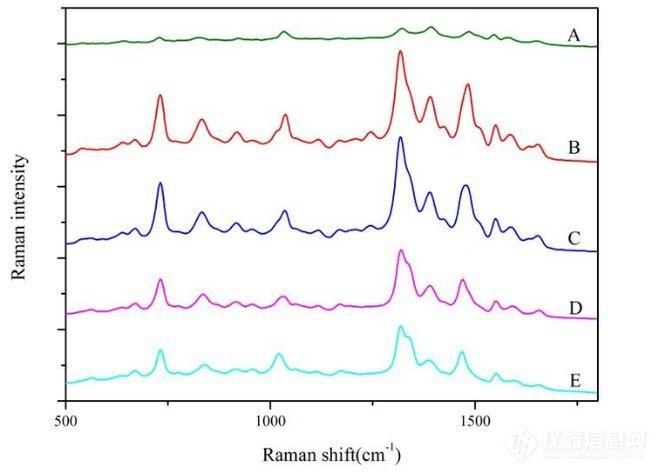 A:拉曼基底添加量为100 μL;B:拉曼基底添加量为200 μL;C:拉曼基底添加量为300 μL;D:拉曼基底添加量为400 μL;E:拉曼基底添加量为500 μL