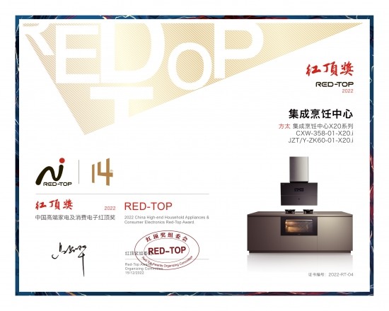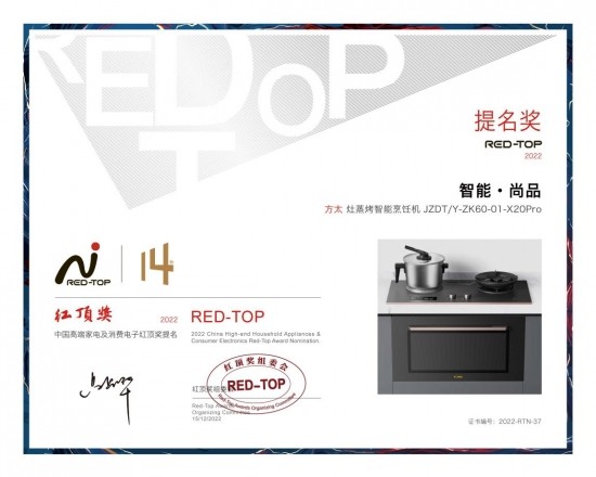 近日,由中国家用电器协会指导、红顶奖组委会主办的“第14届中国高端家电趋势发布暨红顶奖颁奖盛典”在北京召开,作为厨电行业领军者的方太,从众多参选的家电品牌中脱颖而出。其中,方太集成烹饪中心X20系列以高端专业的厨房解决方案荣膺红顶大奖,功能多样、智能便捷的灶蒸烤智能烹饪机JZDT/Y-ZK60-01-X20Pro荣获红顶奖提名奖。