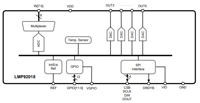 LMP92018是一个完整的模拟监测和控制电路,它集成了八通道10位模数转换器(ADC)、四个10位数模转换器(DAC)、内部基准、内部温度传感器、12位GPIO端口和10MHz SPI接口。