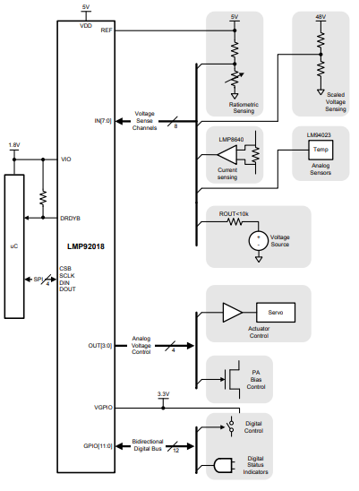 GPIO端口和SPI兼容接口都具有独立的电源引脚,使LMP92018能够与低压微控制器接口。