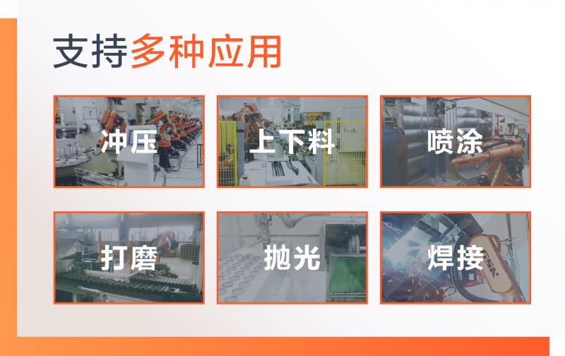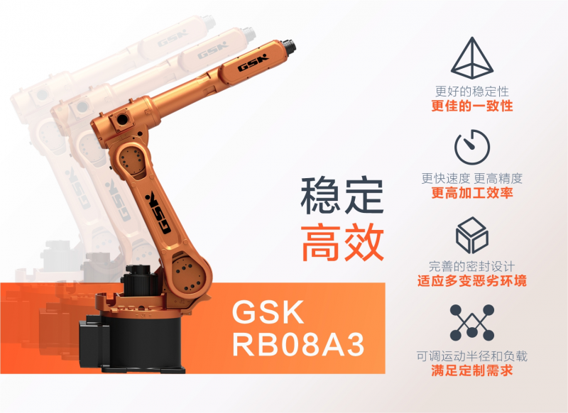 GSK RB08A3系列搬运机器人适用于冲压、上下料、喷涂、打磨、抛光、焊接等多种应用。