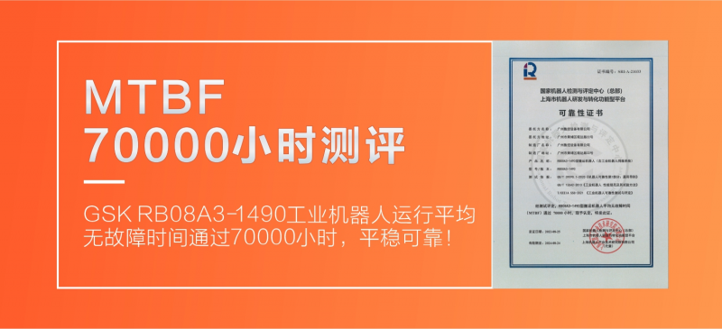 近日,由广州数控设备有限公司自主研发的GSK RB08A3-1490工业机器人顺利通过了上海机器人产业技术研究院的MTBF 70000小时测评。
