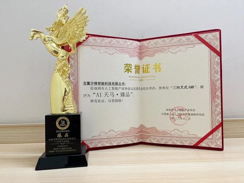 1月5日,粤港澳大湾区AI领袖峰会在深圳市召开,大会以“AI引领,数智未来”为主题,汇聚多家人工智能知名品牌企业和AI领域权威院士专家,共同探索AI产业化高质量发展之路。同期举办2022年度“AI天马奖”颁奖盛典,经过层层选拔和审核,宇锋智能所创产品三向叉机器人凭借硬核领先的技术实力,从众多产品中脱颖而出,荣获AI天马“臻品”奖。