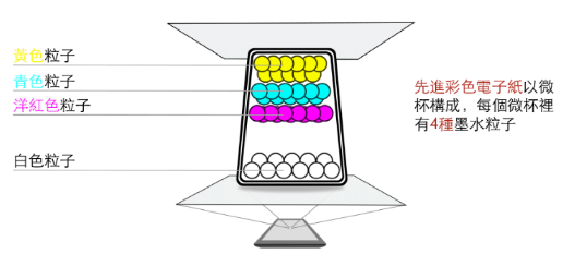 SiPix微杯技术是通过驱动电极上下移动颗粒,使颗粒颜色(白色)和液体颜色交替显现。现在元太科技推出的三色显影技术也正是利用SiPix微杯技术实现的,且彩色电子纸价格普遍高于黑白显影电子纸。