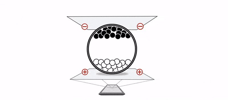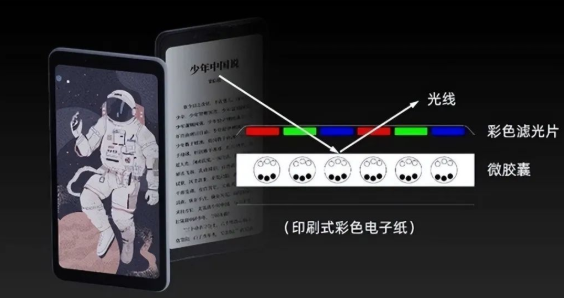 E ink微胶囊技术是利用屏幕表面附着数百万颗体积很小的“微胶囊”,通过电荷改变微胶囊里带有负电子的黑色粒子和带有正电子的白色粒子摆列顺序,呈现出黑白显影效果。