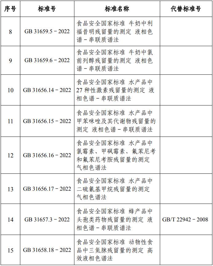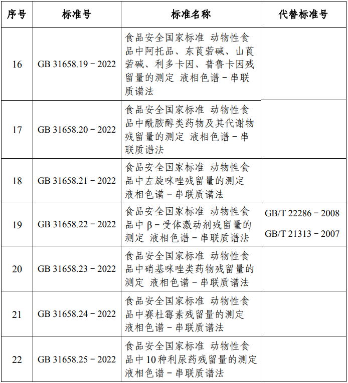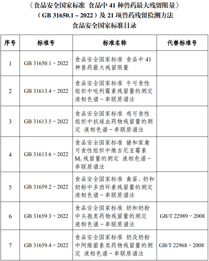 近日,农业农村部农产品质量安全中心公布《食品安全国家标准 食品中41种兽药最大残留限量》(GB 31650.1-2022)及21项兽药残留检测方法食品安全国家标准文本参考件,最终文本以中国农业出版社出版文本为准。
