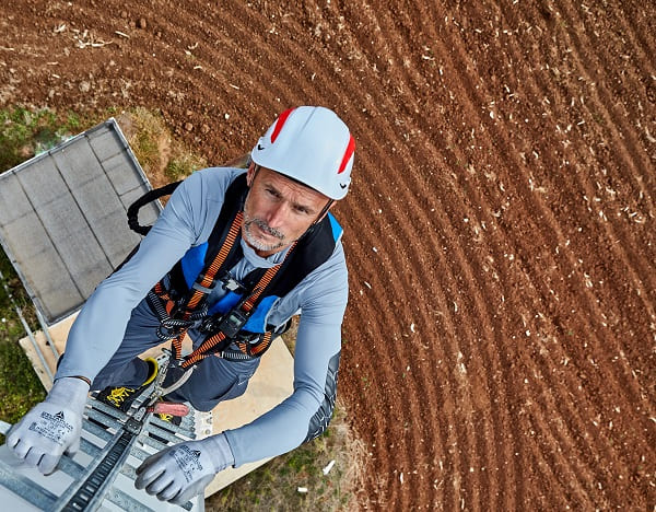 一名风力涡轮机维修工人佩戴由Dainese集团创建的新公司D-Air Lab开发的WorkAir安全气囊。