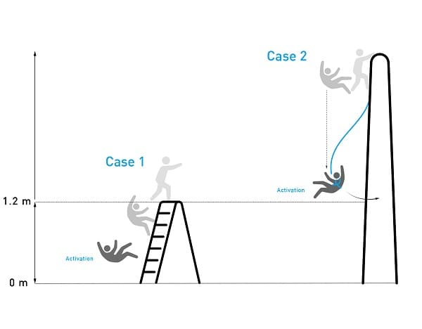 信息图显示了WorkAir安全气囊的两个使用案例,该气囊在坠落到地面的情况下自动展开,也在系好安全带的人撞向墙壁或垂直表面的情况下展开。