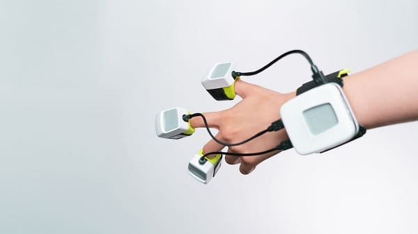 TouchDiver是一个由衍生公司WeArt开发的设备,与一个虚拟现实面罩结合使用。他们称之为 "可穿戴技术",其商业历史始于监测脉搏和计算步数的智能手表和健身手镯。但它们的诞生更早,而且发生在机器人实验室里。