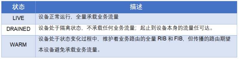 在隔离状态中,BGP的策略只允许广播设备其自身地址,维护其网络可达性使得设备还处于可管理、可运维的状态。在此状态下,业务流量会绕开该设备。