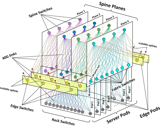 Pod内FSW交换机的数量和Spine的平面数量是一致的,这也就是说F4架构(图2)的FSW是4台,F8/F16架构下的FSW分别是8/16台。