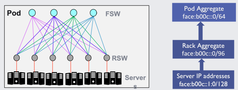 数据中心内有很多IP地址网段,为了减少交换机硬件FIB表的占用以及其高效收敛计算,Facebook在网络拓扑的各个层面上进行了层次化的路由汇聚。对于业务路由,Facebook在IP地址段规划上面就紧密配合了分层路由聚合的实施。