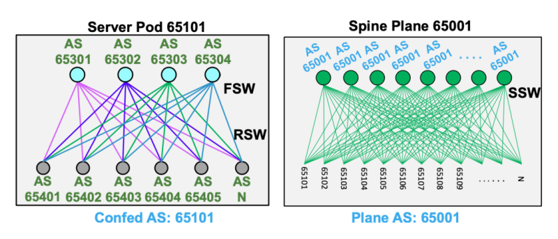 服务器Pod内,子AS号分配: · RSW分配子AS号:65401 ~ 654XX (XX = RSW的数量); · FSW分配子AS号:65301 ~ 65304 (F4架构);