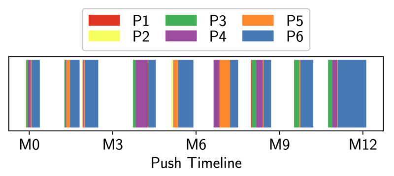 下图展示了12个月的期间内进行的9次推送中各个阶段的时间花费。下图同时也展示了高速迭代在数据中心的可行性,在快速的时间尺度上修复性能和安全问题。也使得其他应用程序能够利用BGP的特性实现快速革新。P6阶段最为费时,因为它需要处理数量庞大的交换机。
