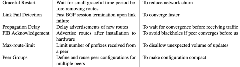 Labovitz 等人对互联网上BGP运行存在的一些不稳定因素做了一些研究:一些有问题的BGP更新报文会成为导致路由不稳定的主要因素。我们看看如何在数据中心内部来应对这些可能出现的问题,这样才能确保数据中心内部运行BGP的稳定性。这些问题如下表所示: